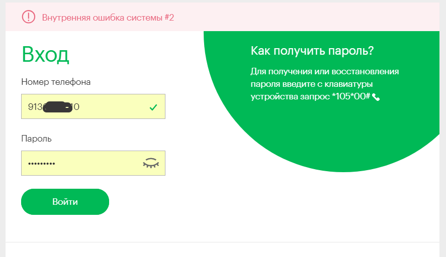 - Как и было сказано ранее, основной ошибкой неудачного входа в личный кабинет является неправильно введенный пароль или же неверно прописанный номер телефона. Для того, чтобы получить пароль повторно, воспользуйтесь USSD-запросом *10500#. Если же после повторного ввода аутентификационных данных появляется такая же ошибка, необходимо обратится на “горячую линию” по номеру 8-800-333-05-00.