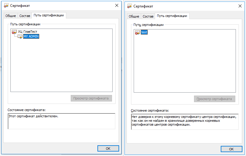 Сначала проверьте, строится ли цепочка доверия. Для этого нужно открыть файл сертификата, а затем вкладку Путь сертификации.