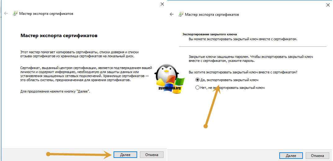 У вас откроется мастер переноса сертификатов, на первом шаге, просто нажимаем далее. После чего вас спросят, что вы хотите экспортировать, выбираем пункт «да, экспортировать закрытый ключ вместе с сертификатом»
