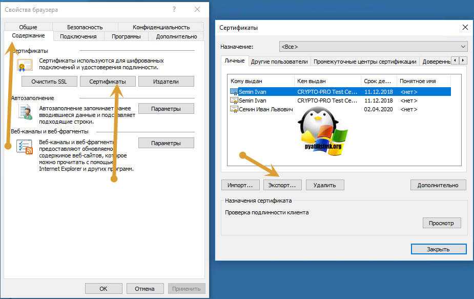 В Internet Explore, откройте «Свойства браузера — Содержание — Сертификаты»