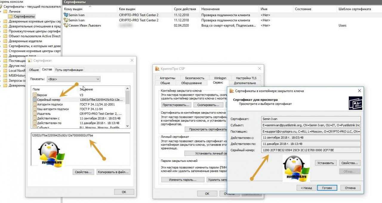 Откройте там контейнер «Личное — Сертификаты». Если у вас в контейнере не один сертификат с одинаковым именем, такое может быть, то откройте сертификат в оснастке mmc и в КриптоПРО и сравните серийные номера сертификата.