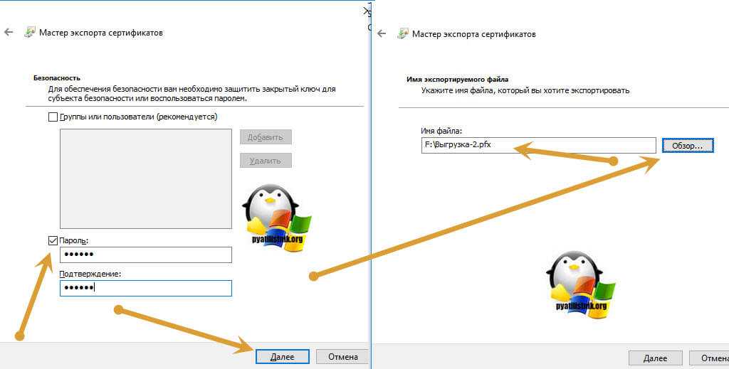 Далее вы задаете обязательно пароль и указываете имя и место, где будите сохранять ваш переносимый контейнер с зарытым ключом в формате pfx.