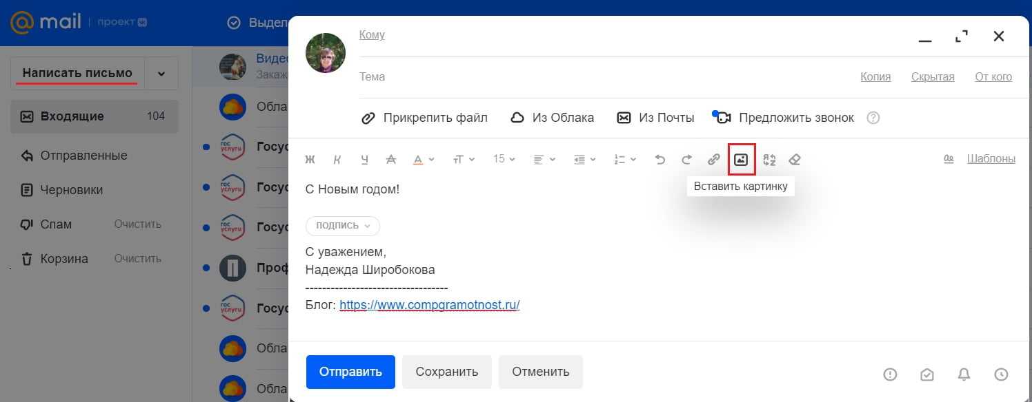 Рис. 1. Кнопка «Вставить картинку» в почте Майл ру.