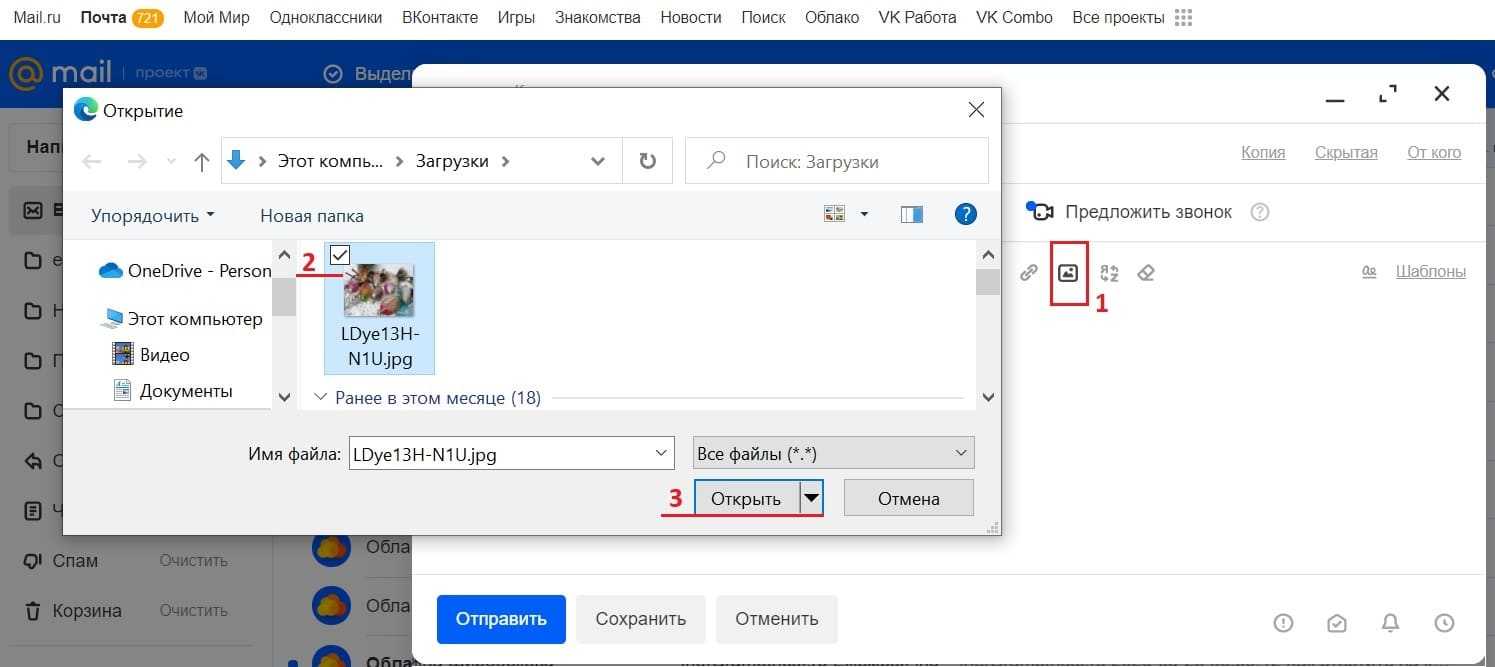 Щелкнув на кнопку «Вставить картинку» (цифра 1 на рис. 2) в письмо, увидим на экране окно «Открытие». Здесь следует найти подходящую открытку для письма майл ру. Затем выделить ее (2 на рис. 2) и нажать «Открыть» (3 на рис. 2).