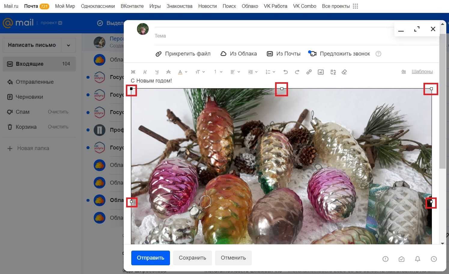 Как изменить размеры? Если кликнуть по открытке, вставленной в письмо, она будет выделена. Причем по периметру картинки есть маленькие квадратики (обведены в красные рамки на рис. 3). Если подвести к любому из них мышку, курсор поменяет свою форму. Он станет похожим на двунаправленную стрелку. В этот момент надо нажать на левую кнопку мыши и потянуть в нужную сторону.