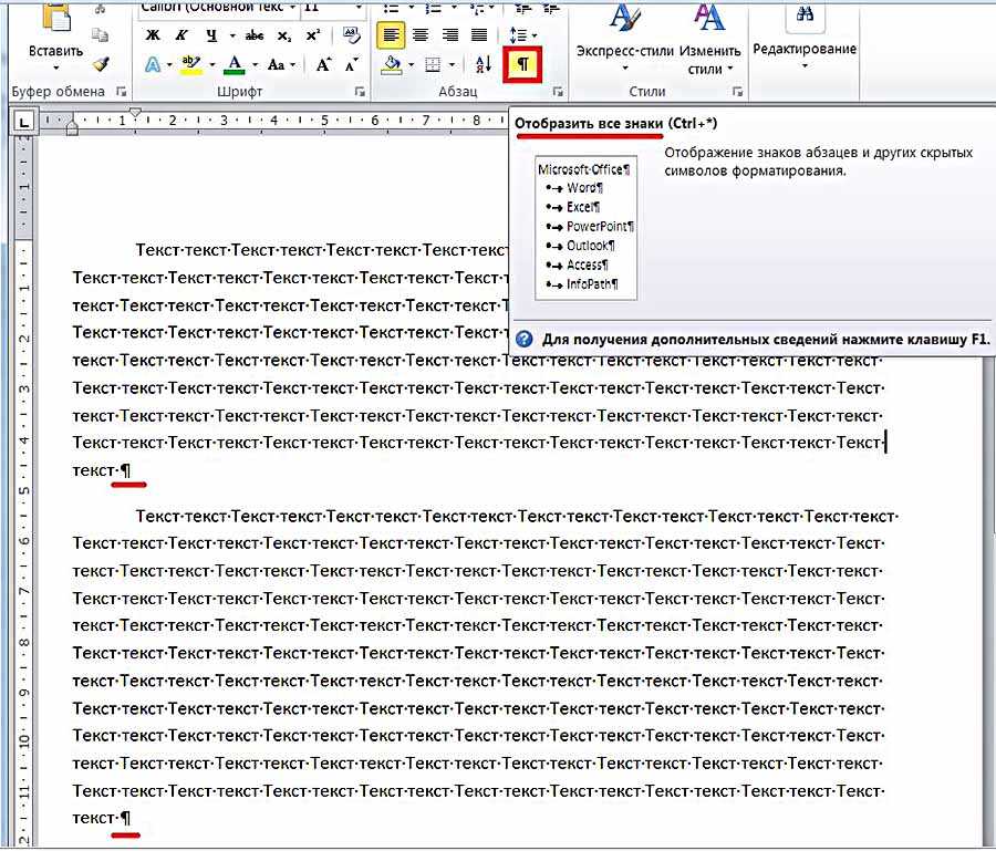 Если вы не видите пробела, тогда можно воспользоваться функцией – напечатанные знаки, которая указывает пробелы мелкими точками. Это будет весьма удобно для контроля лишних пробелов. В готовом документе таких точек видно не будет.