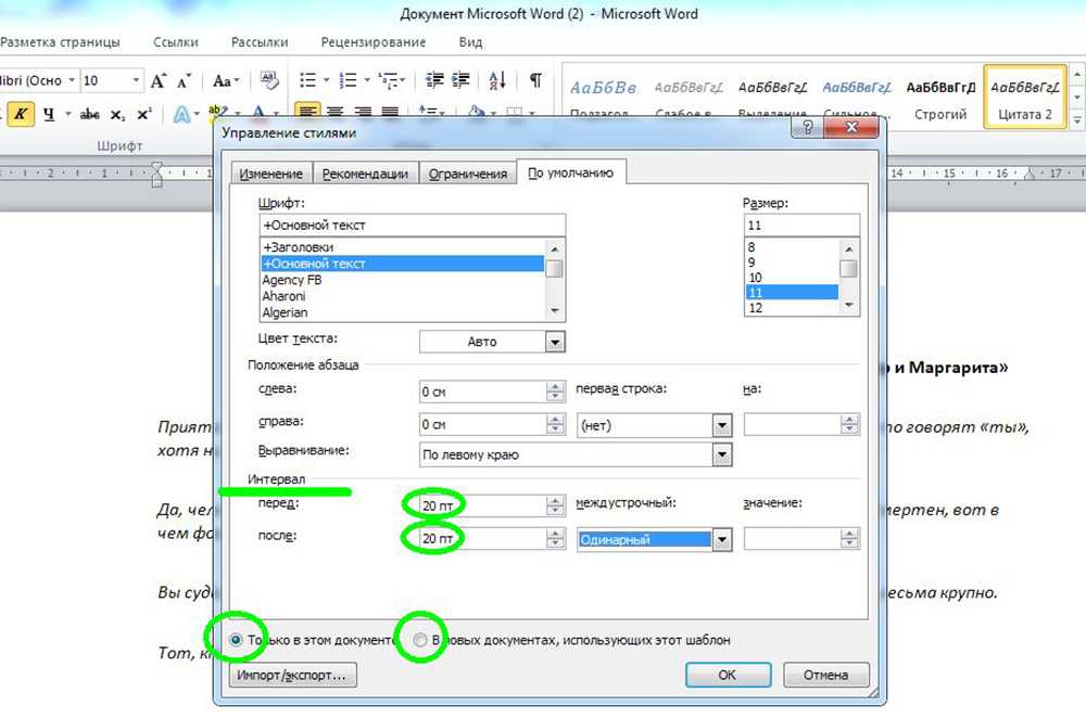 В окне «Управление стилями», после открытия вкладки «По умолчанию» настраивается изменение междустрочного интервала. Укажите подходящие значения в группе «Интервал». В параметрах стилей, помимо интервала между строками абзаца, имеется возможность изменить интервал до или после абзаца.