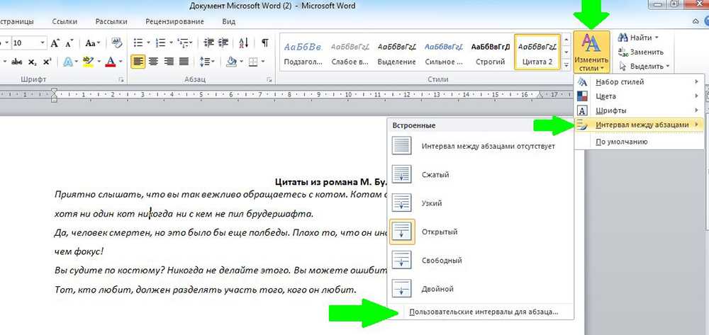 - На вкладке «Главная» выбрать изменение стилей. Затем — «Интервал между абзацами», а после — «Пользовательские интервалы».