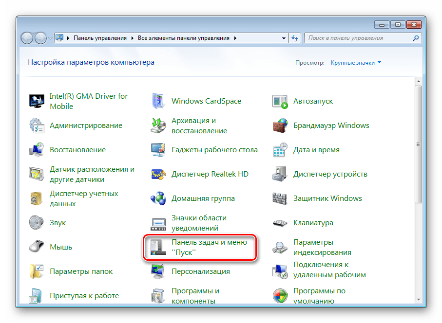Среди всех значков отыщите «Панель задач и меню «Пуск»».