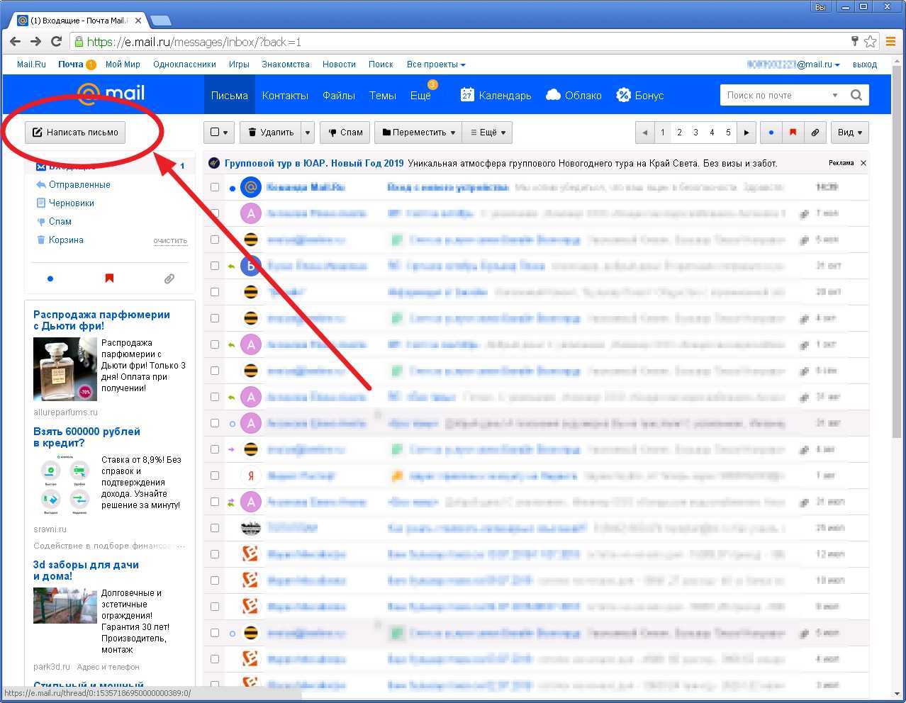 Итак, авторизуемся на сервисе Mail.ru и инициируем создание нового письма.