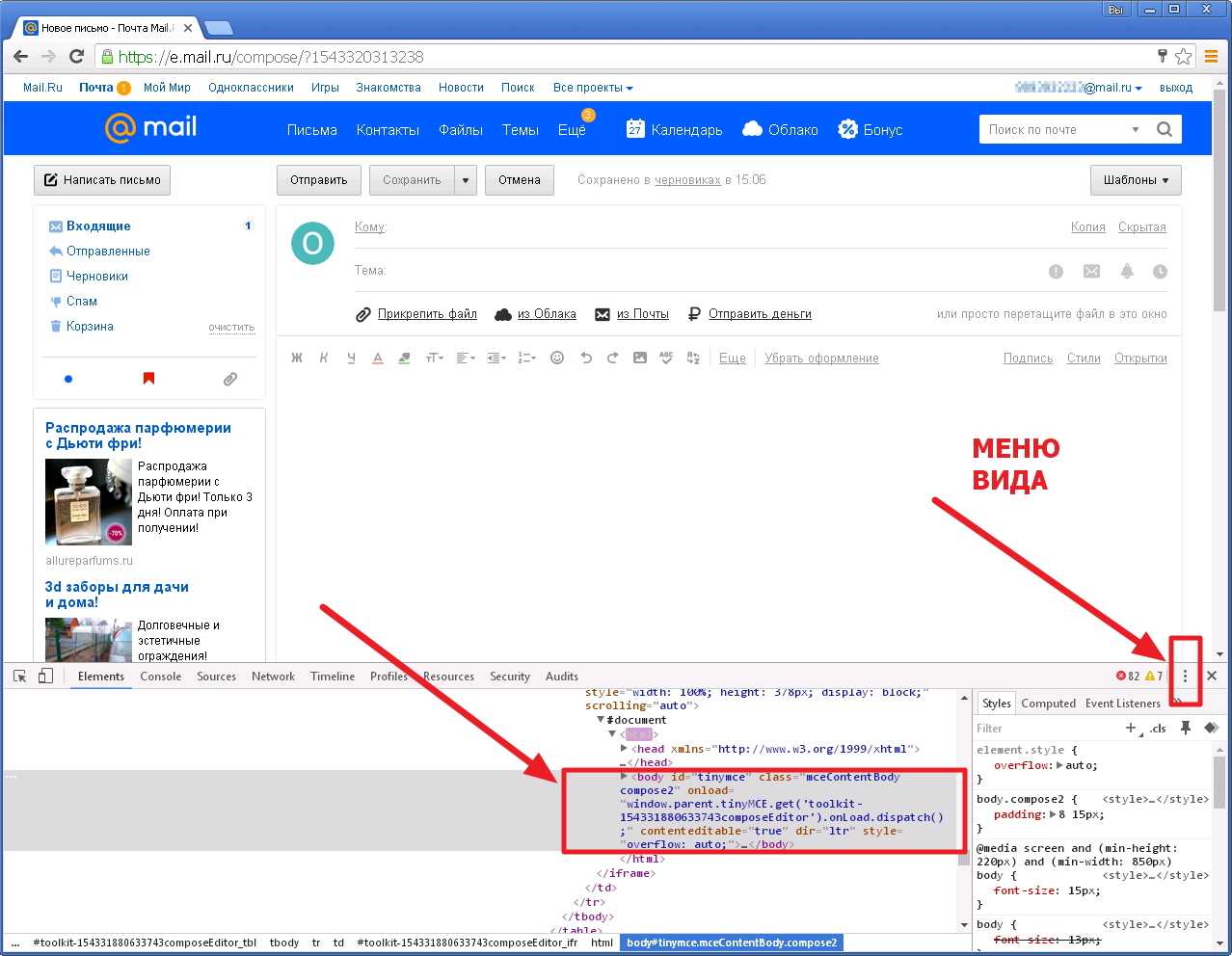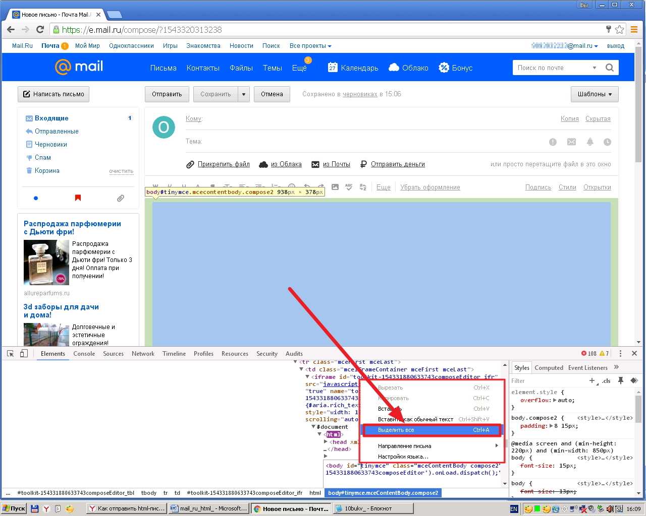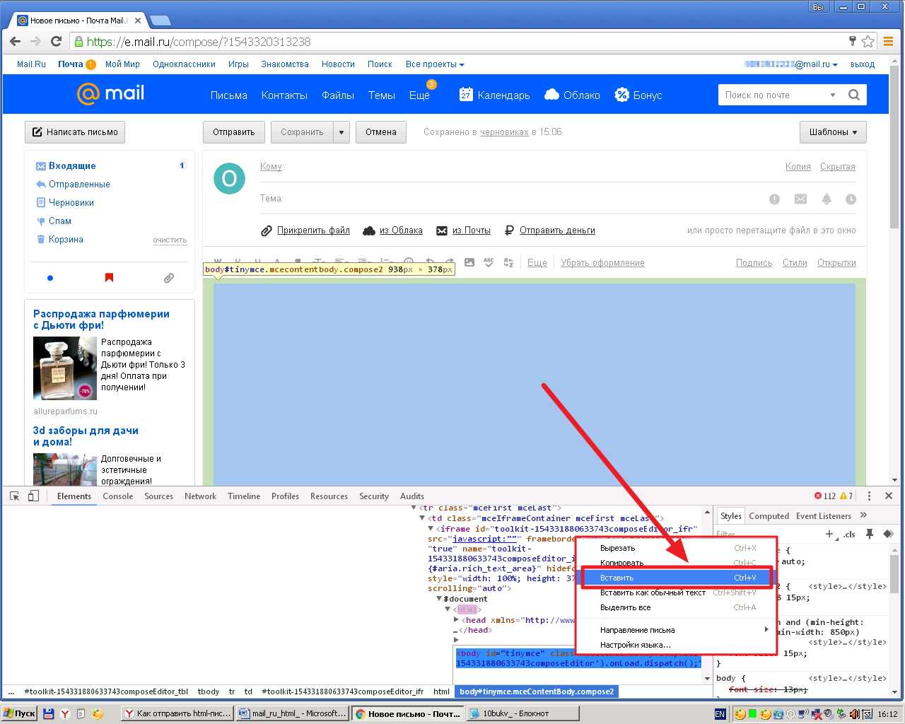 Здесь наша работа будет состоять из двух частей. Первая — это подготовка к корректировке html-кода в браузере, а вторая — подготовка кода нашего письма к внедрению в браузер при помощи самого простого редактора — «Блокнота».