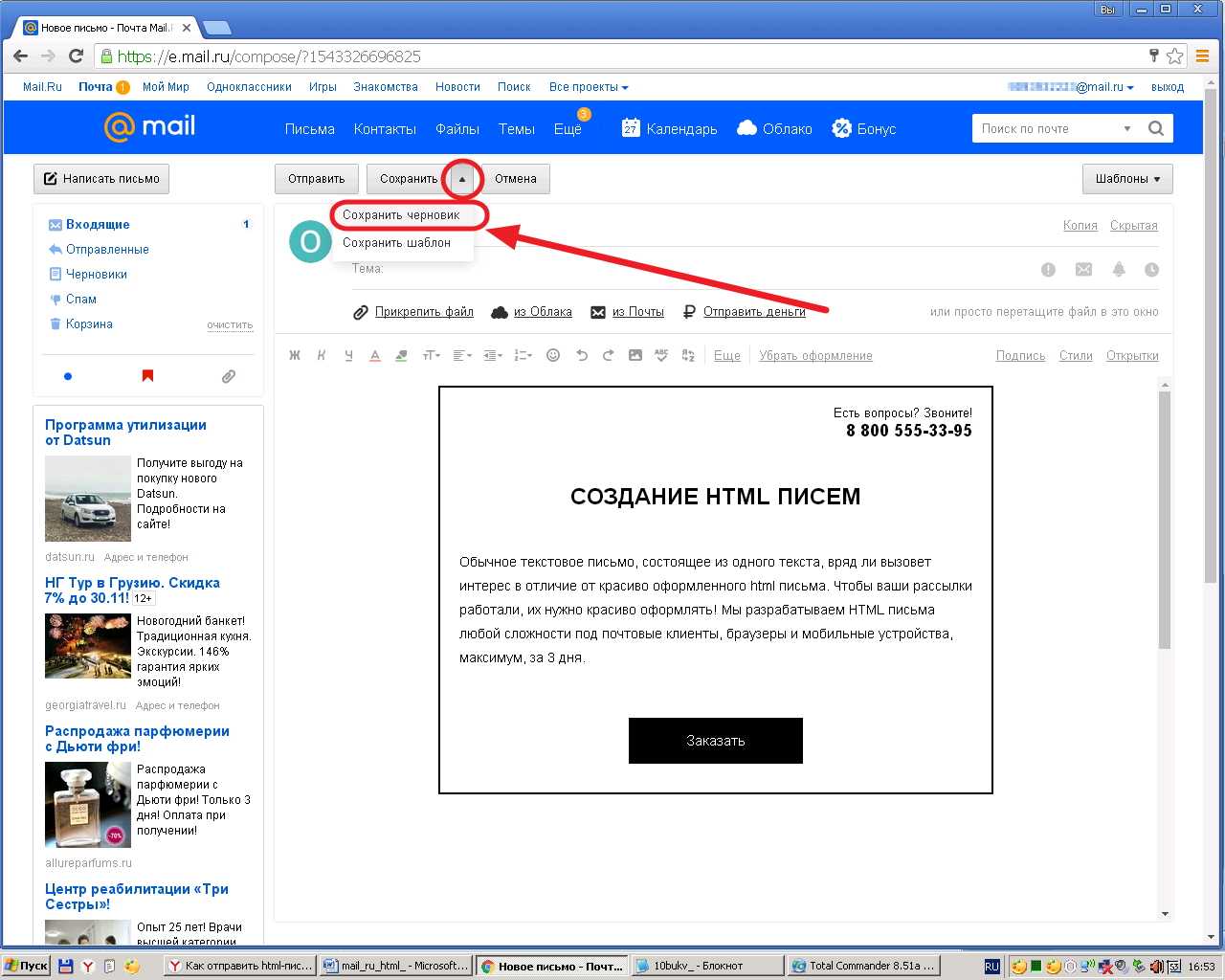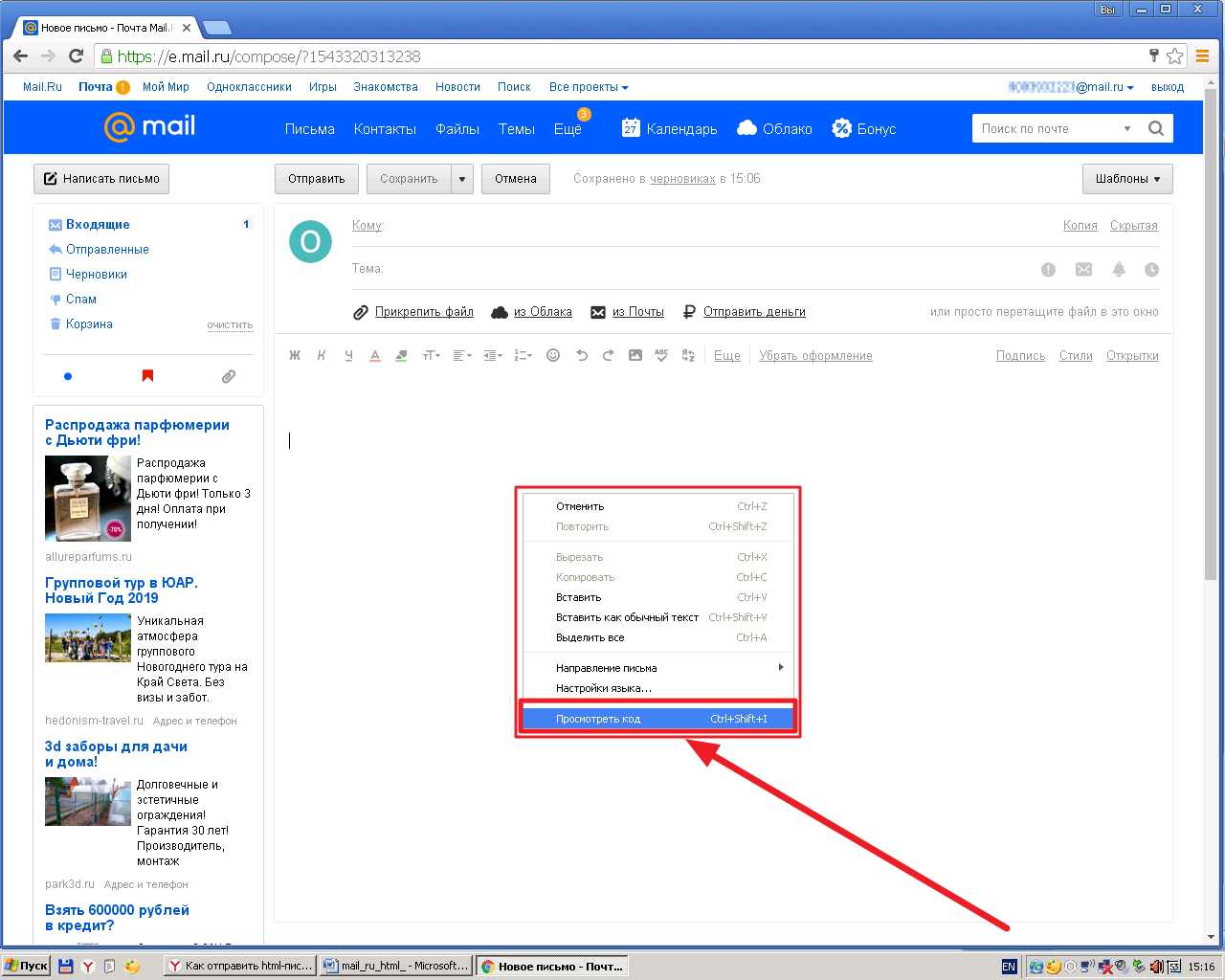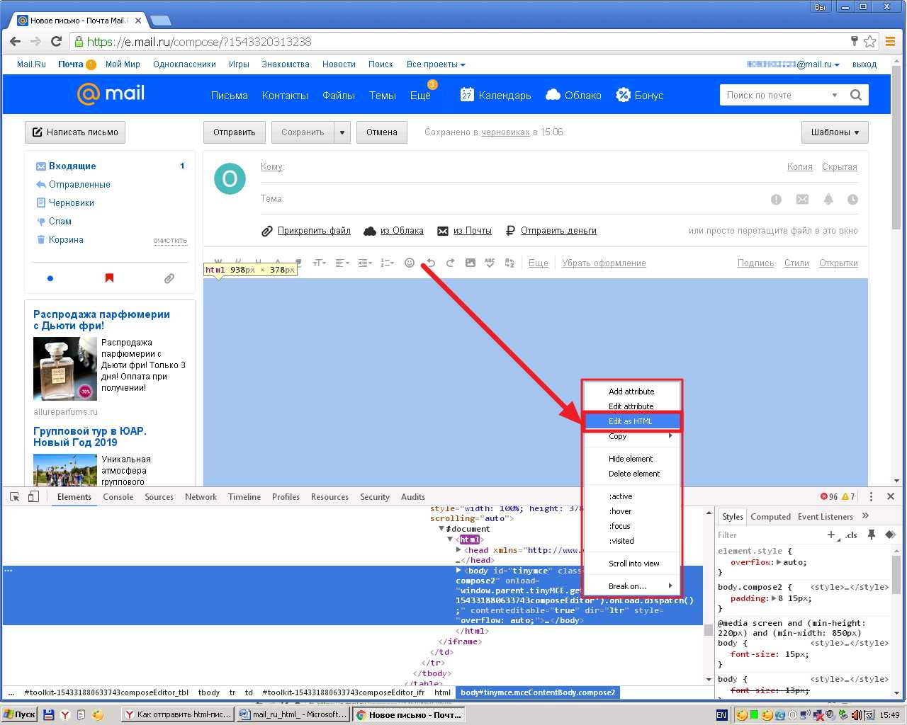 Здесь наша работа будет состоять из двух частей. Первая — это подготовка к корректировке html-кода в браузере, а вторая — подготовка кода нашего письма к внедрению в браузер при помощи самого простого редактора — «Блокнота».
