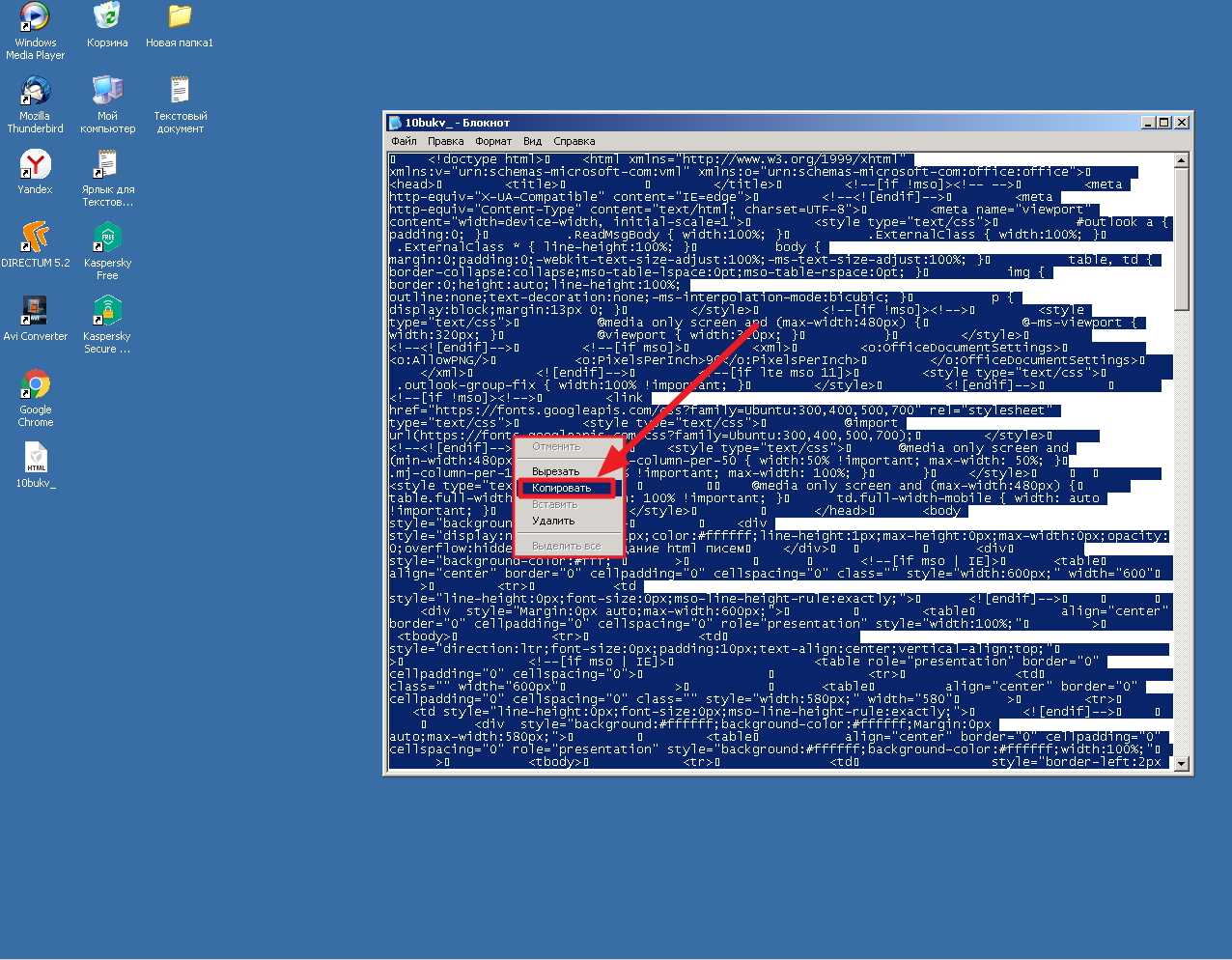 И весь текст с кодом письма из «Блокнота» скопировать в буфер обмена.
