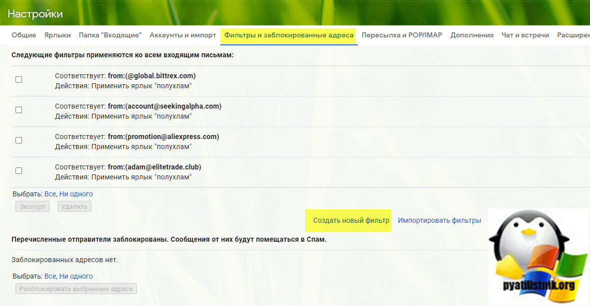 Выбираете пункт «Фильтры и заблокированные адреса», тут будут отображаться ваши правила сортировки писем. В самом низу будет кнопка «Создать новый фильтр».