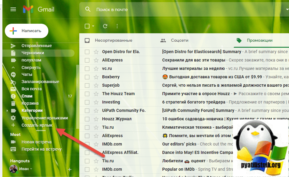 Ярлык должен нести в названии для вас какую-то информация, например «Хлам» или «Youtube». Давайте я покажу, как их создавать. В левой части найдите раздел с письмами и в самом низу нажмите «Создать ярлык».