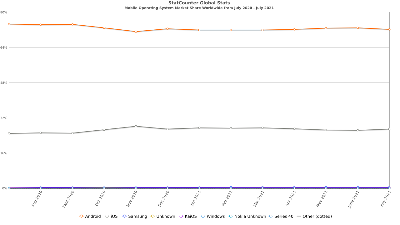 Более 72% всех мобильных устройств в мире работают на Android (данные StatCounter на июль 2021 года). ОС удерживает свое лидерство на мобильном рынке с 2012 года (вот уже 9 лет).