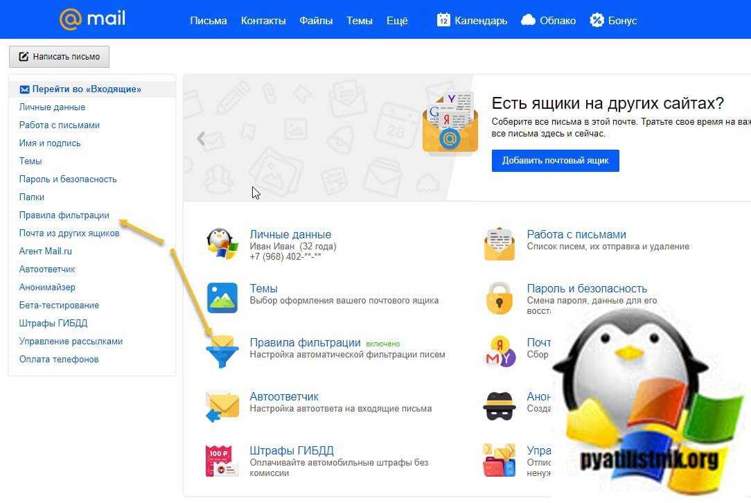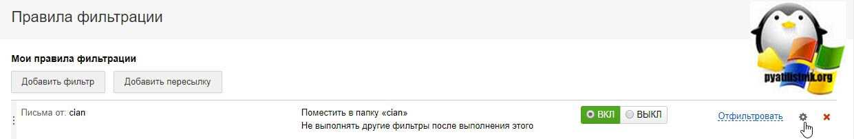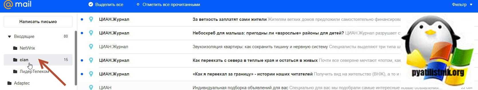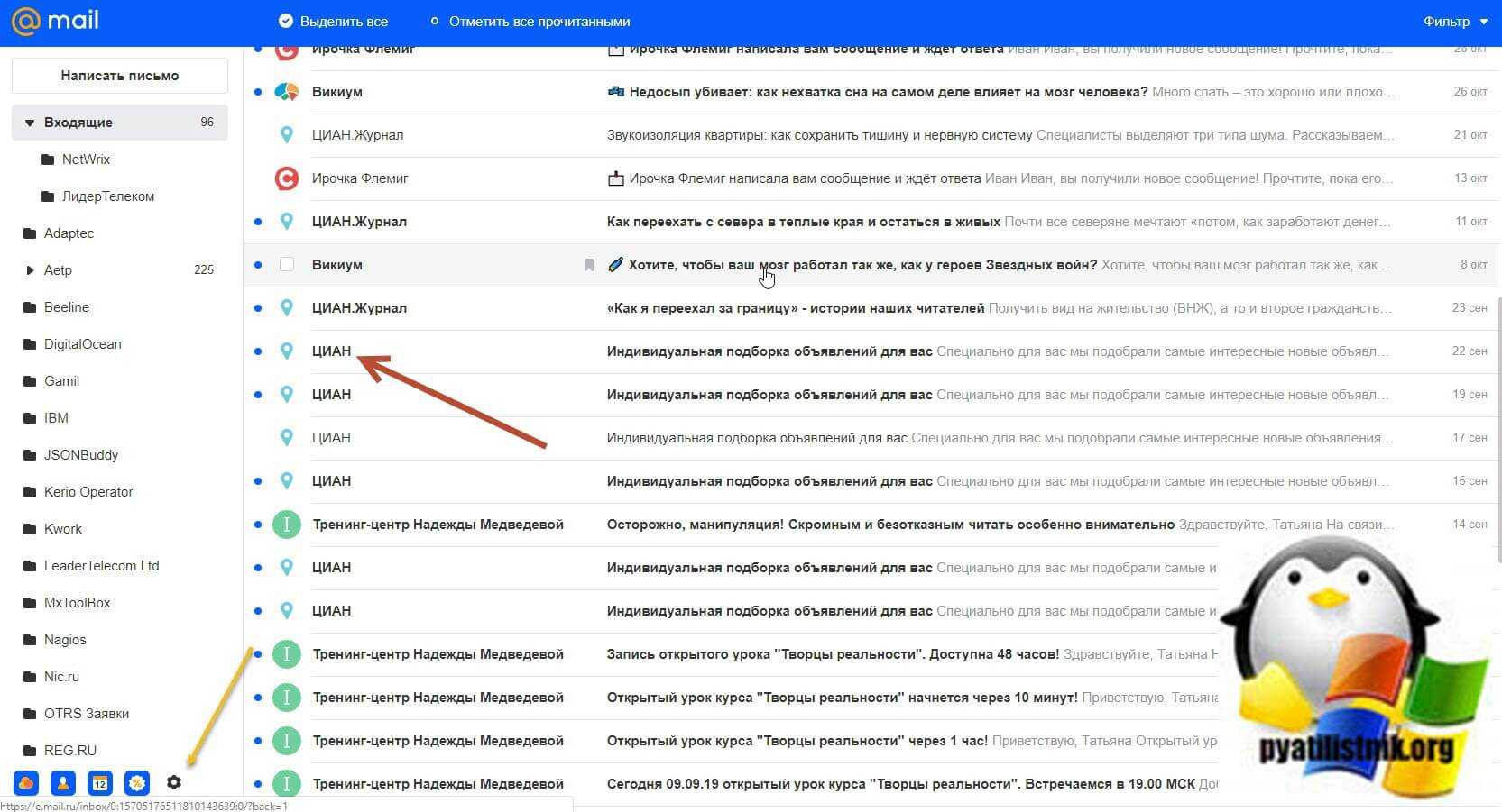 теперь давайте произведем сортировку входящей почты на mail.ru. В моем примере я буду, это делать для писем от ЦИАН. Как видите у меня от них много писем. Чтобы найти правила обработки входящей почты, вам нужно в левом нижнем углу перейти в настройки.