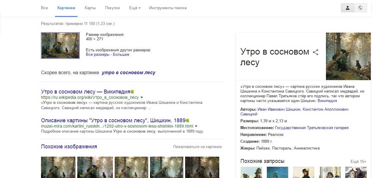 Так как мы использовали для поиска картину, найдя изображения на сайтах, Google автоматически дал название предмету нашего интереса. Результатами поиска стали похожие изображения различного качества и разрешения, ссылки на различные сайты, где дается описание картины. Все тоже самое, как и при поиске словами, только в этом случае вы использовали изображение, к примеру если вам понадобится та же картина, но в более высоком разрешение, Вам просто нужно нажать на ссылку «Большие» либо «Похожие изображения» и перед Вами появится то, что Вы ищете.