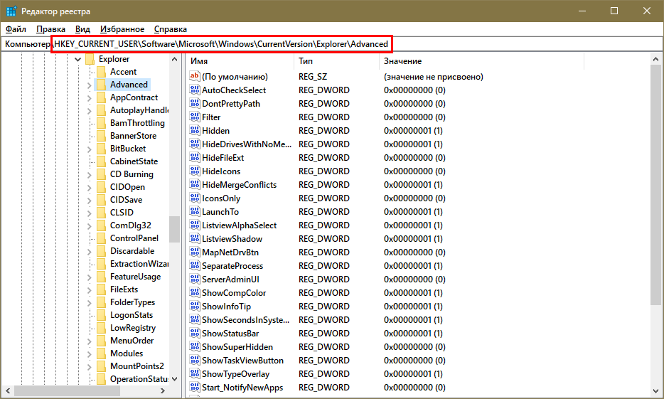 Аналогичный результат приносит смена опции через «Редактор реестра»: