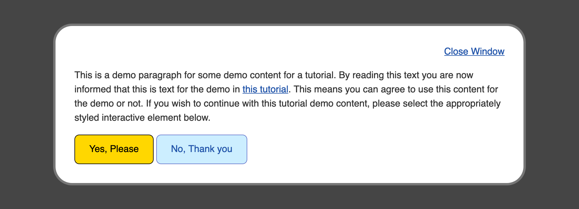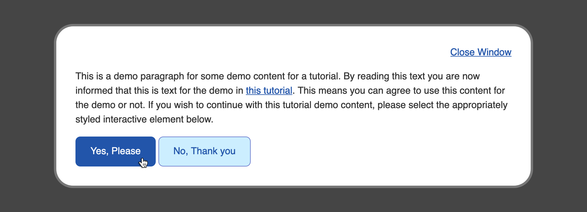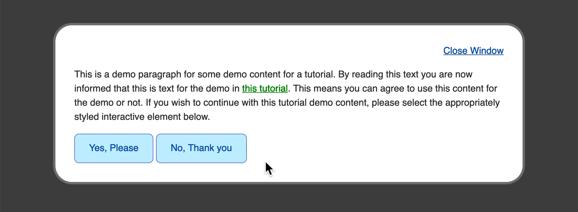 Save your changes to and return to your browser to refresh the file. The look of the Yes, Please and No, Thank you buttons will change to match the properties. The text is the same blue as the default style, with a much lighter blue in the background, and another deep blue for the border. The next image demonstrates how this will appear in the browser:
