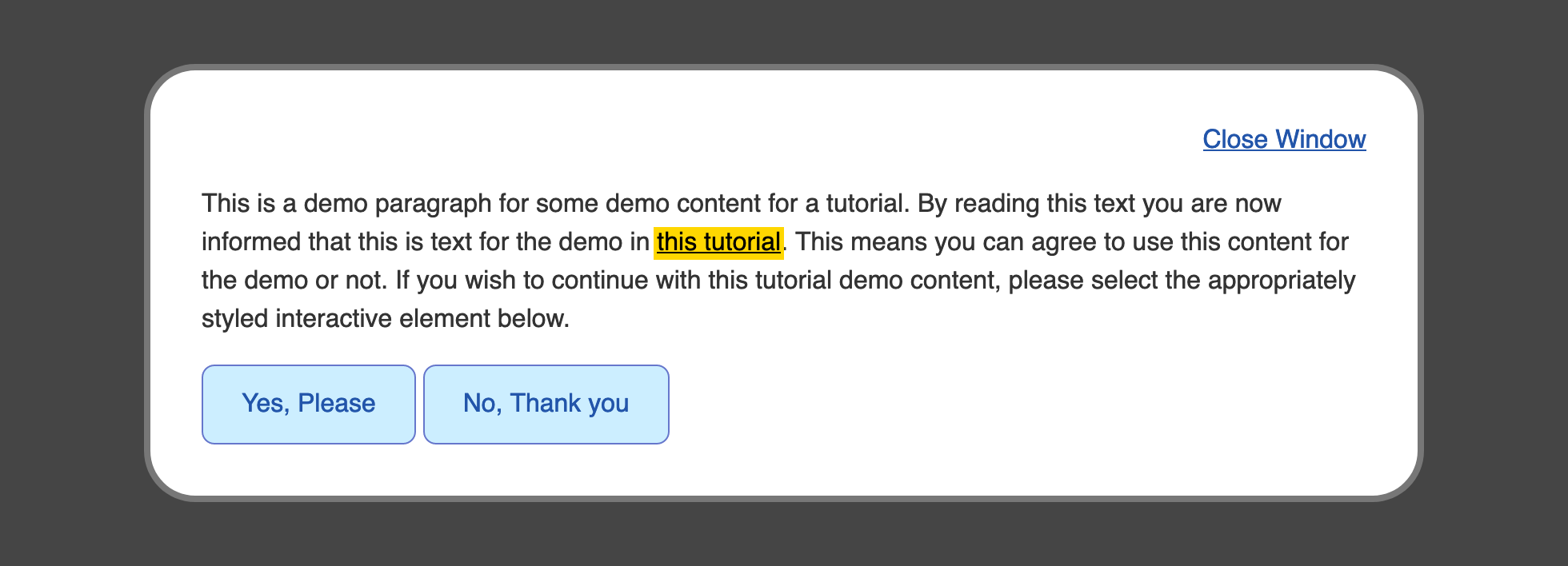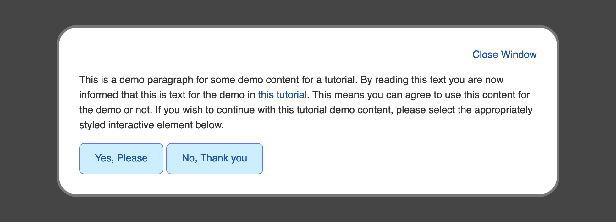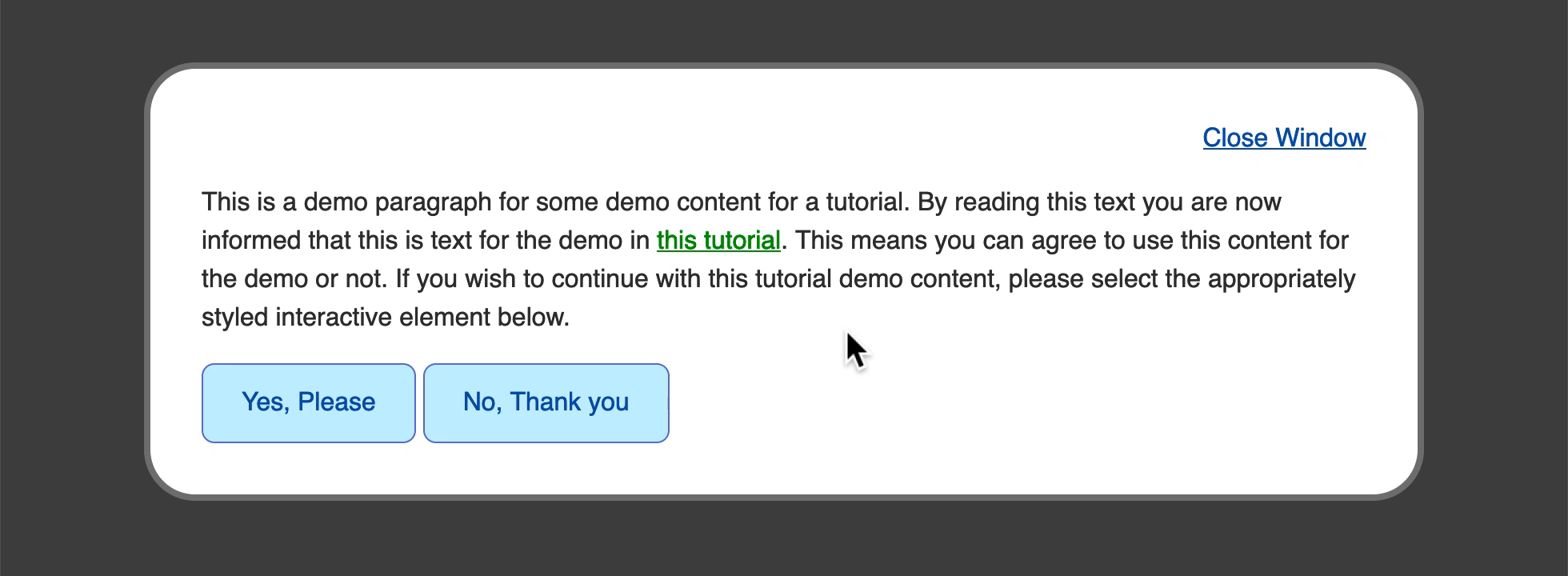 Save your changes to and return to your browser to refresh the file. The look of the Yes, Please and No, Thank you buttons will change to match the properties. The text is the same blue as the default style, with a much lighter blue in the background, and another deep blue for the border. The next image demonstrates how this will appear in the browser: