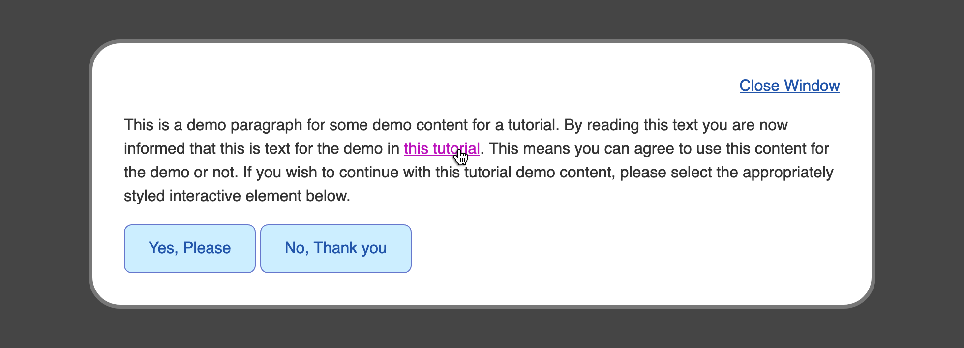 Save the changes to your file and refresh in your browser. Hover over either the this tutorial link or the Close Window button to initiate the color change on hover. The following image shows what the hover state looks like when the cursor is over the this tutorial link.