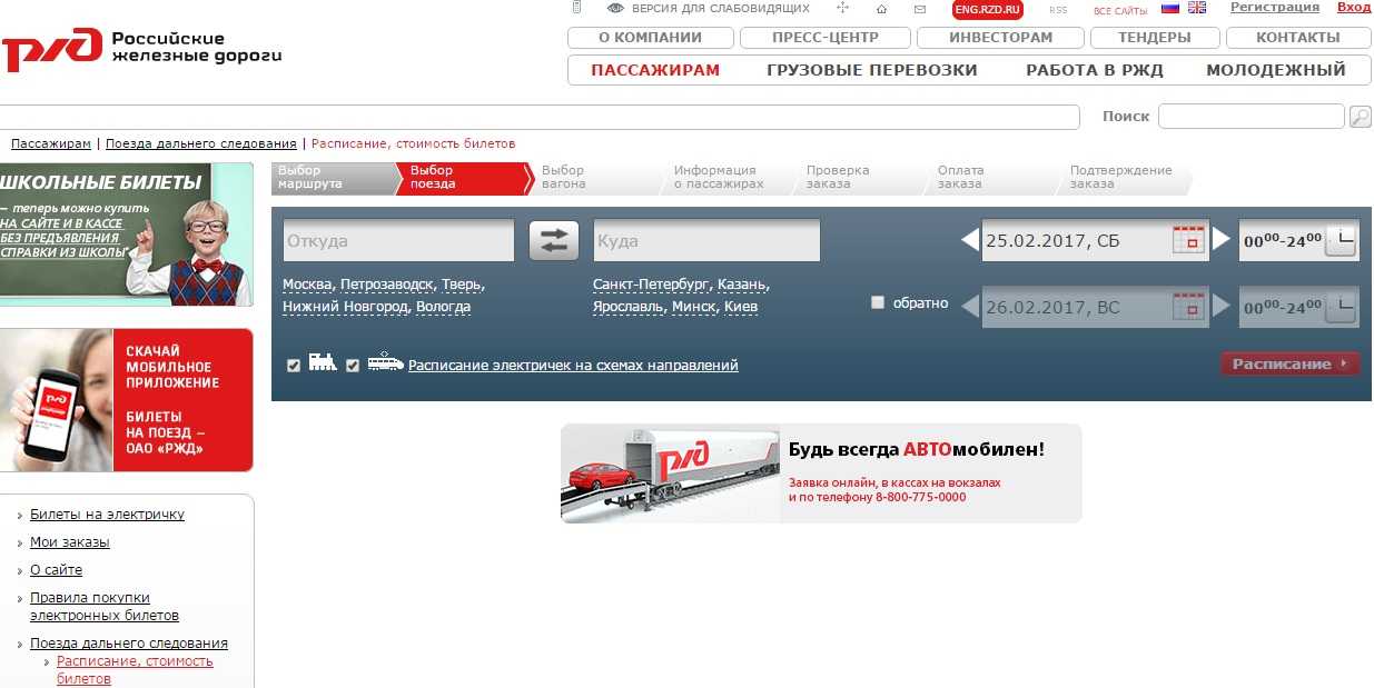 Наш интернет-сервис это надежный сайт жд билетов, он позволяет найти необходимое количество мест совершить покупку в режиме онлайн. Для этого достаточно выбрать билет, произвести оплату и распечатать посадочный талон. Помимо этого, здесь можно ознакомиться с расписанием и ценами на услуги, которыми можно воспользоваться в пути.