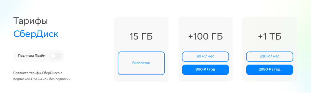 Совершенно бесплатно каждый клиент получает 15 Гб в подарок, а для участников СберПрайма доступны целых 30 Гб свободного места. За большее количество гигабайт на облаке придется заплатить.