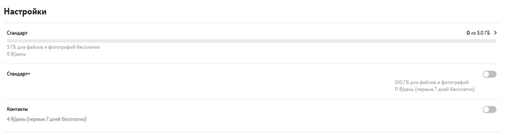 Цена: 350 Гб предоставляются за 11 рублей в сутки (другие тарифы отсутствуют). Стоимость хранения контактов – 4 рубля в сутки. За оплату длительного периода скидок нет.