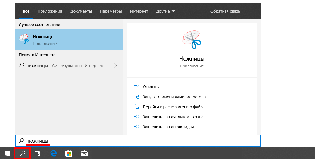 1. В строке поиска на панели задач или в Пуске напечатайте Ножницы и запустите приложение.