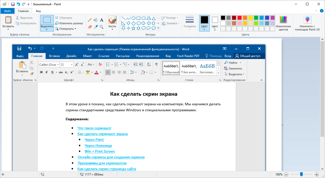 Преимущества метода: Этот метод не требует установки дополнительных программ (Paint доступен в любой версии Windows); Доступ в Интернет не требуется; вы можете редактировать изображение; Вы можете выбрать удобный формат файла.