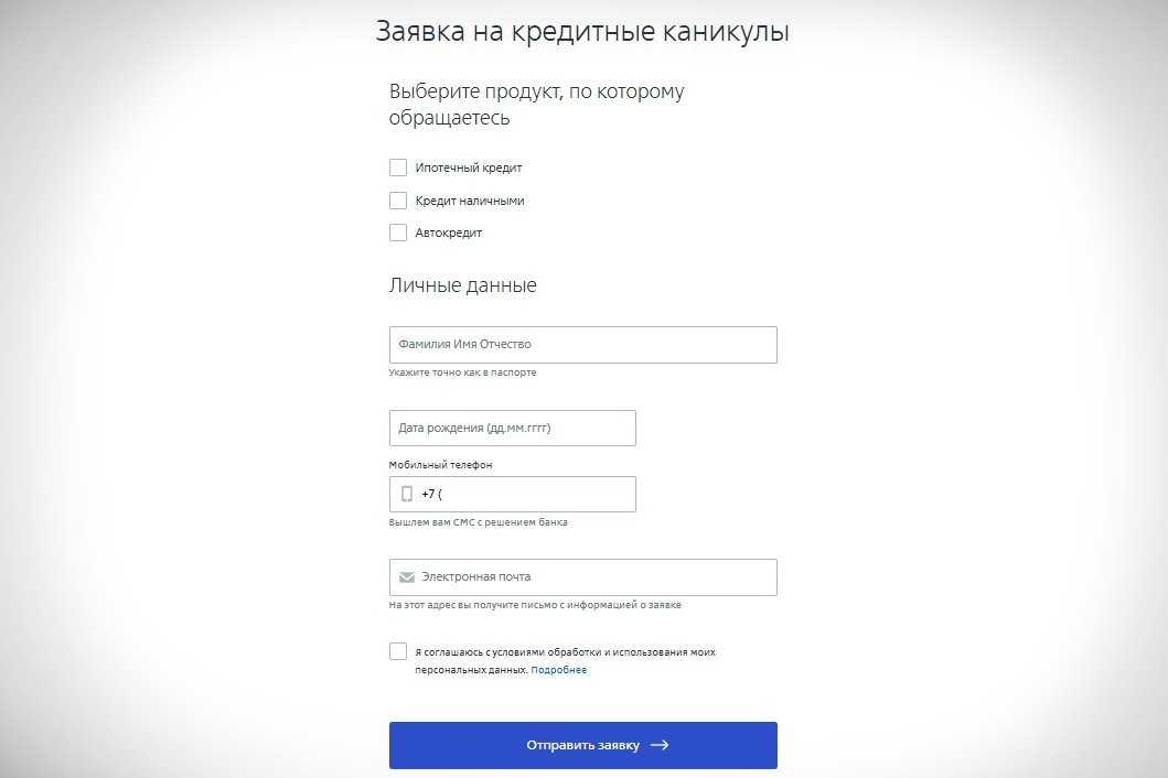 Ранее подача заявки на каникулы была возможна дистанционно — через сайт банка ВТБ. Сейчас эта страница отсутствует. Для отправки заявки через личный кабинет потребуется всего несколько шагов.