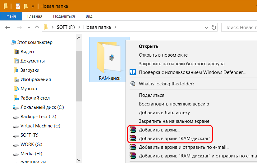 Используя вышеупомянутый проводник, находим папку, которую нужно упаковать, и кликаем по ней правой кнопкой мыши. Сразу же всплывет дополнительное меню, в котором следует выбрать один из предложенных вариантов (формулировки могут варьироваться в зависимости от вашей операционной системы): «Добавить в архив…» или же «Сжать файл в rar».