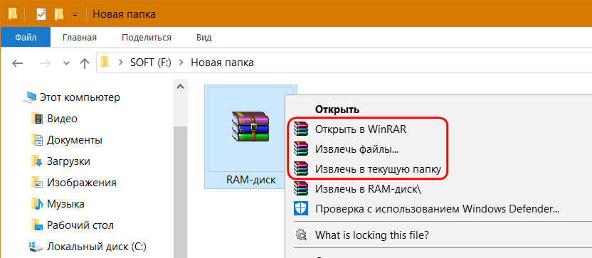 Чтобы распаковать файл RAR, или любой другой архив, достаточно кликнуть правой кнопкой по файлу и выбрать один из вариантов: