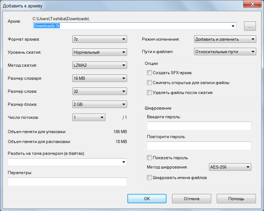 Программа может быстро упаковать данные в формат 7z с параметрами архивирования по умолчанию. А при выборе пункта меню «Добавить к архиву» получим возможность применения отдельных возможностей архиватора.
