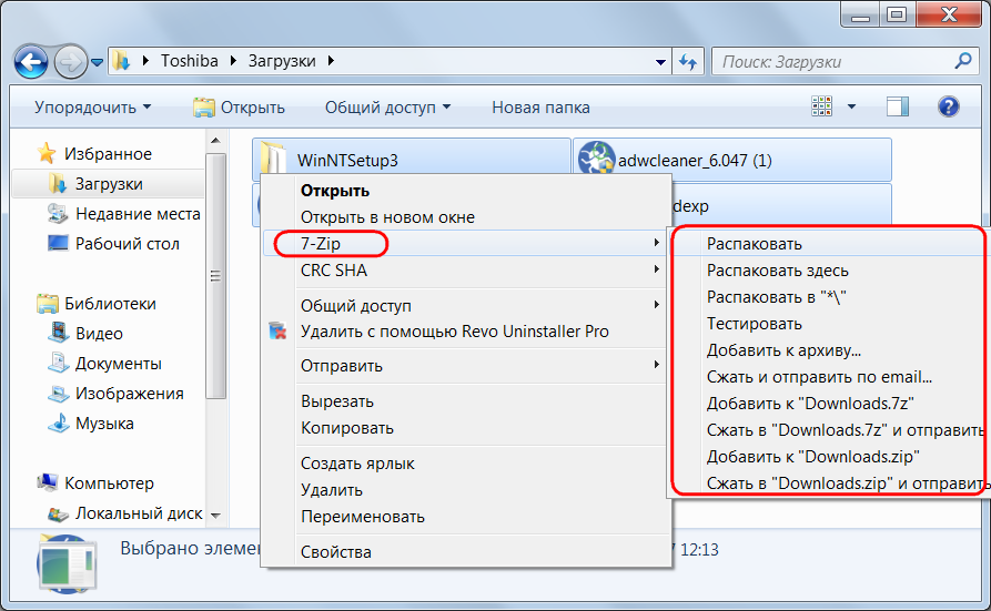 Разархивировать данные можно непосредственно в окне архиватора, а также из контекстного меню проводника.