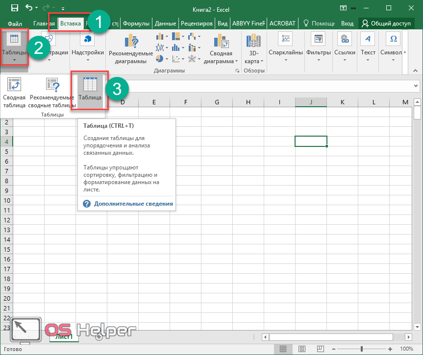 - Перейдите на вкладку «Вставка». Нажмите на кнопку «Таблицы» и выберите последний пункт.