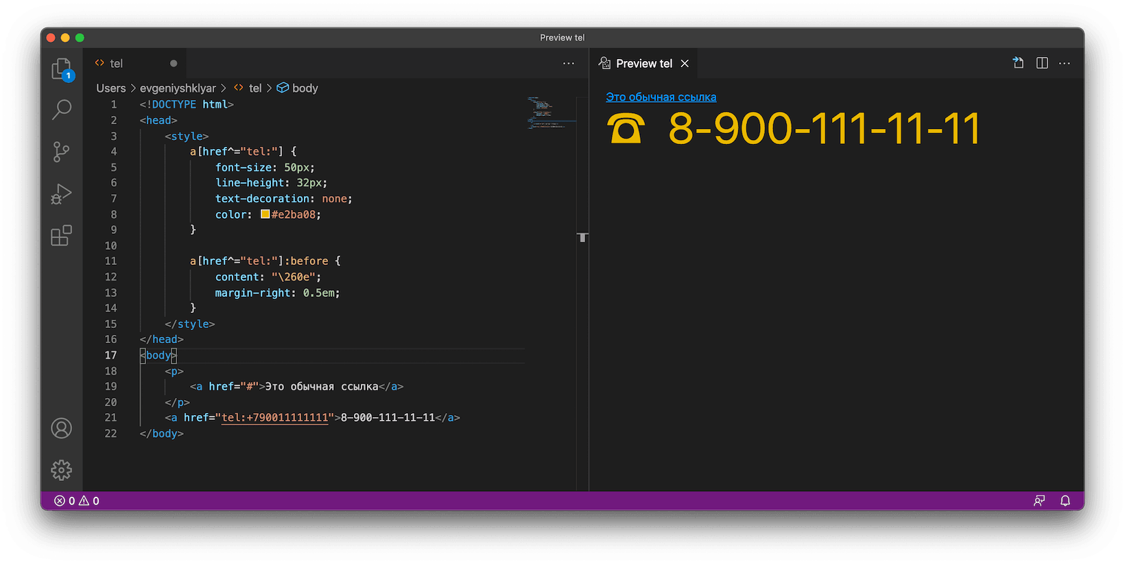 Ссылка на номер телефона размечается с помощью специального префикса перед номером телефона — tel: .