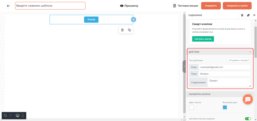С помощью Cheapsender вам необязательно использовать сложные формулы с различными атрибутами. Вы можете выбрать функцию «Отправить письмо» и указать все значения самостоятельно. Ссылка mailto сгенерируется автоматически. Если нужно изменить название кнопки, то кликните по ней двойным щелчком мыши и введите желаемое имя. Изменить дизайн также можно – для этого в правой части есть отдельные разделы.