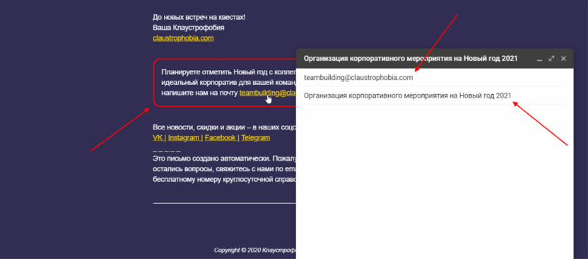 При всем этом следует учитывать, что mailto работает не всегда. Например, если попробовать кликнуть по такой ссылке на компьютере, то может ничего не произойти. В таких случаях рекомендуем добавлять кнопку с возможностью скопировать адрес. Если подписчик не сможет воспользоваться ссылкой mailto, то он в один клик скопирует почту и отправит письмо самостоятельно. В мобильных приложениях, как правило, подобные элементы не требуются, так как в них все работает стабильно.
