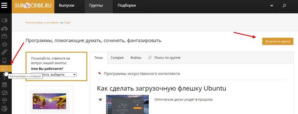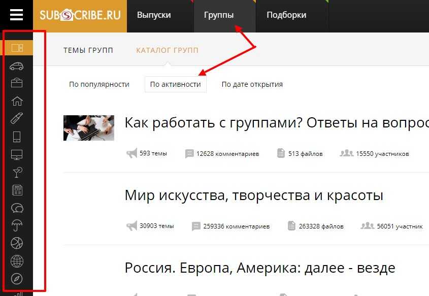 С левой стороны сервиса Сабскрайб есть панель управления, в которой указаны категории групп по темам: