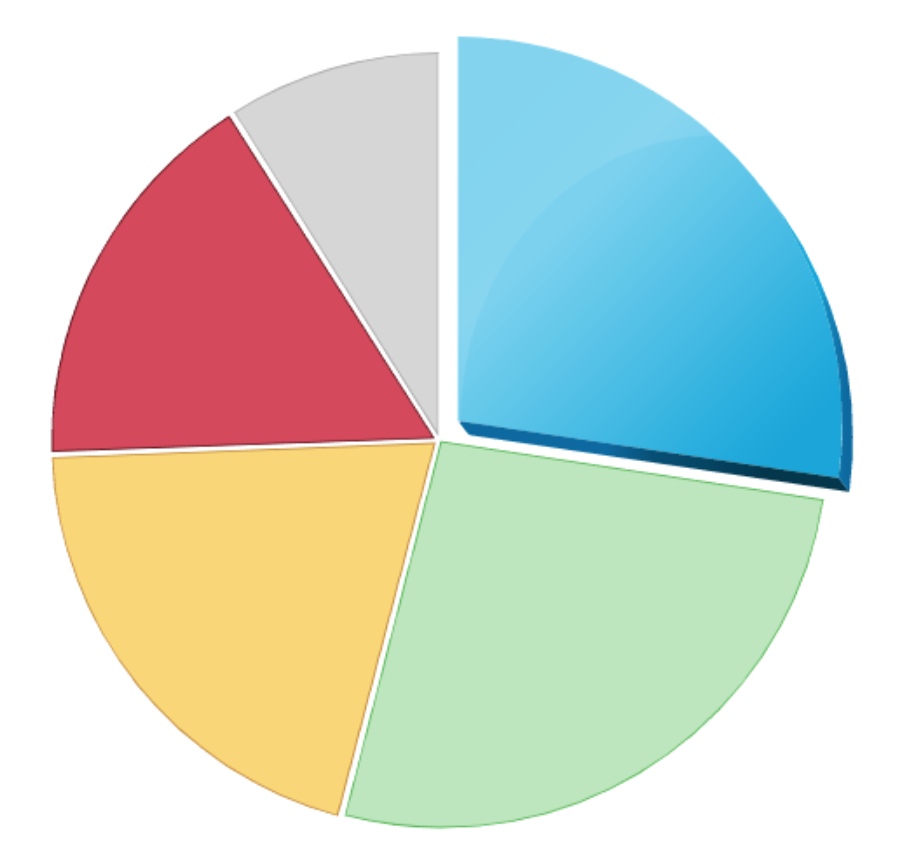 To draw a pie chart, we draw a number of pie slices, each made up of an arc and a pair of lines to the center of that arc. We can compute the angle taken up by each arc by dividing a full circle (2 π ) by the total number of responses and then multiplying that number (the angle per response) by the number of people who picked a given choice.