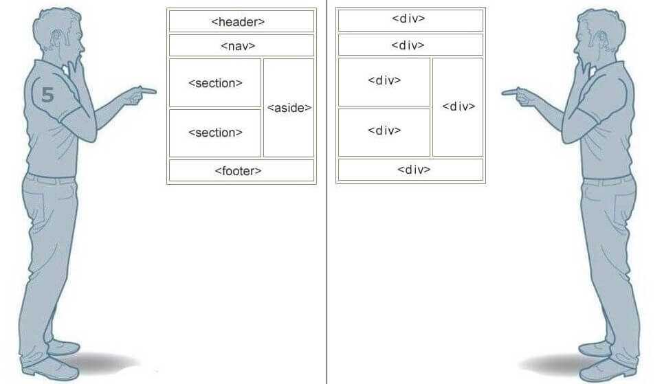 HTML 5 включает в себя множество различных тегов, чьи имена отражают тип их содержимого, и эти теги могут использоваться вместо тега <div>. HTML 5 предлагает новые блочные семантические элементы для определения различных частей веб-страницы, вы можете детально с ними познакомиться в статье учебника HTML 5 «Теги разметки страницы».
