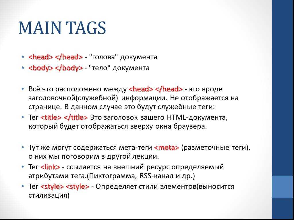 Тег идет парами. Содержимое записывается между открывающим () и закрывающим () тегами.