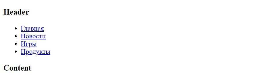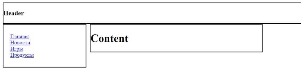 <header> <h3>Header</h3> </header> <nav> <ul class=»menu»> <li><a href=»#»>Главная</a></li> <li><a href=»#»>Новости</a></li> <li><a href=»#»>Игры</a></li> <li><a href=»#»>Продукты</a></li> </ul> </nav> <div class=»content»> <h1>Content</h1> </div> </main> |