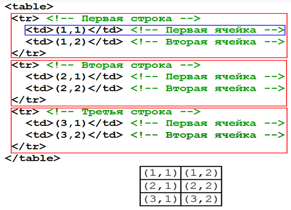 Создания таблицы начинается с тега (от англ. «таблица»). Тег служит для создания строки. В строке располагаются ячейки — тег . Завершается таблица закрывающим тегом