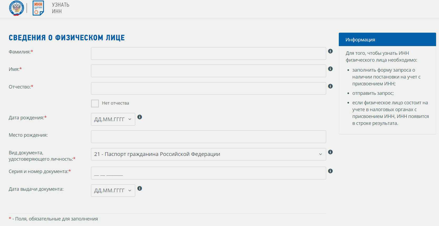 На сайте ФНС можно узнать ИНН по паспортным данным. Ввести нужно имя и фамилию, дату рождения, серию и номер паспорта, дату его выдачи.