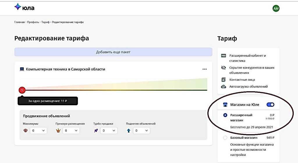Обычно продавец на Юле оформляет платный тариф с незамысловатым названием «Тариф» (это не тавтология), для расширения возможностей пользования сервисом. Такой «Тариф» включает: