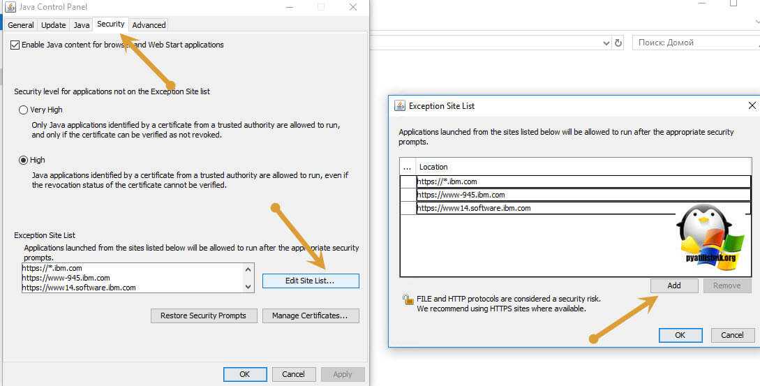 Напоминаю, что подобное мы уже делали, при ошибке: Java Application Blocked. Открываем панель управления Windows, находим там значок Java. Открываем его и попадаем в Java Control Panel. Переходим на вкладку «Security». Оставьте уровень защиты на «High», чуть ниже будет пункт список сайтов для исключения «Exception Site List», по умолчанию он будет пустым. Для его редактирования нажмите кнопку «Edit Site List». Для добавления новой строки нажмите кнопку «Add» и введите нужный вам ресурс. Сохраняем настройки и перезапускаем браузер.