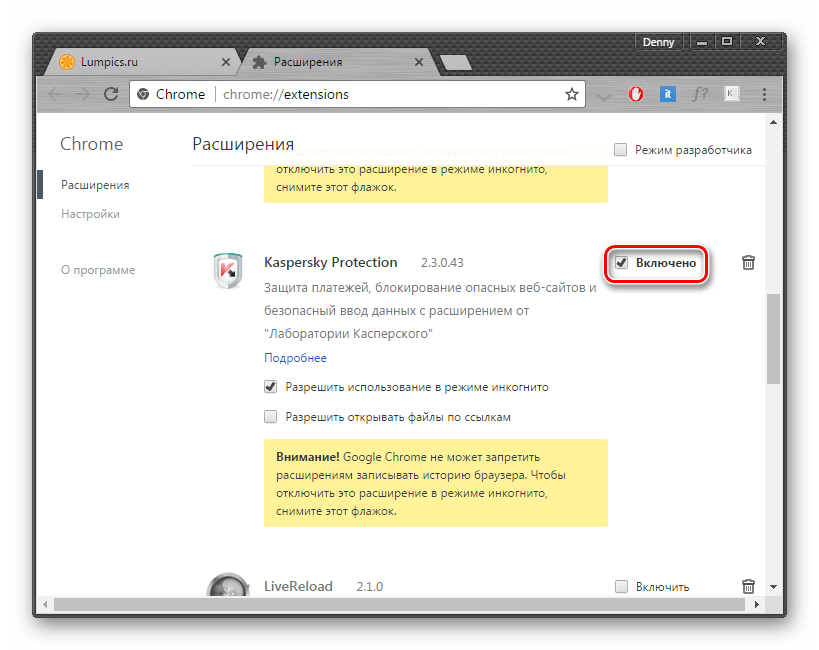 После этого попробуйте отключать расширения (кликнув на галочку возле «Включено»